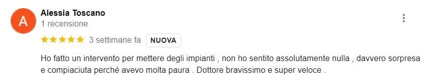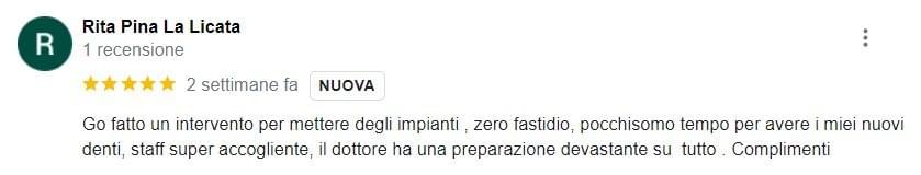“Mi sono trovata molto bene con l’intervento per mettere gli impianti dentali senza bisturi e punti. Il Dottor Longone è un dentista molto bravo e professionale nel suo lavoro. Lo consiglio!”