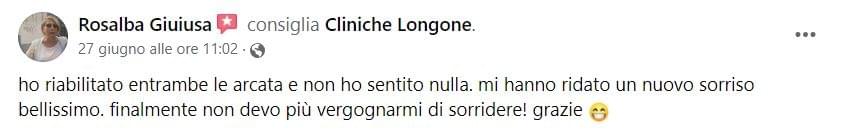 “Sono arrivata qua che bocca non ne avevo e sono uscita con un sorriso favoloso. Consiglio a tutti lo studio del dottor Longone non solo per la bravura con cui esegue i lavori, ma anche per il sostegno morale e psicologico che dona ai suoi pazienti.”